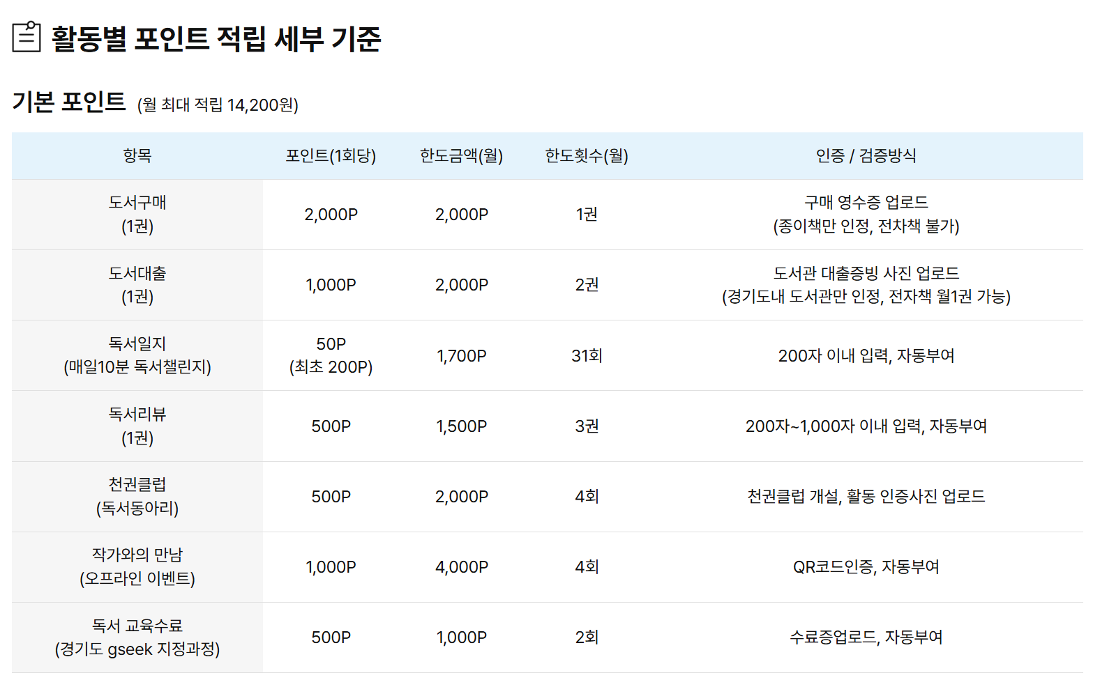 기존에도 도서관 이용 실적이나 독서 프로그램 참여에 따른 마일리지, 기념품 지급 등은 있었지만, 이를 실제로 지역화폐로 환전하여 지역 서점에서 사용할 수 있도록 한 제도는 경기도가 처음입니다. 이번 ‘천권으로 독서포인트제’는 14세 이상 경기도민 4만 명을 대상으로 시행되며, 연간 최대 6만 원(2025년 하반기 기준 최대 3만 원)의 포인트가 지급됩니다.