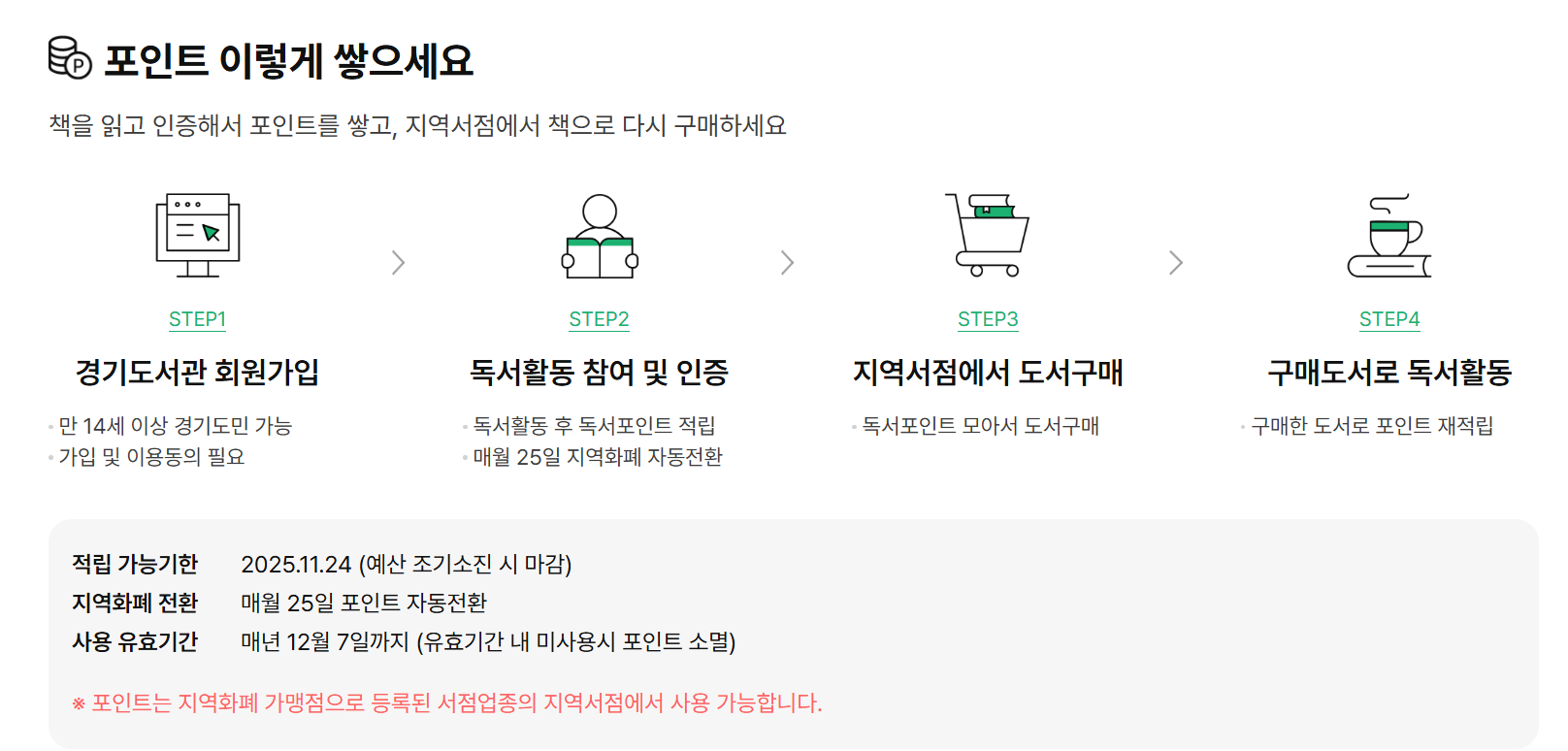포인트 적립 기간은 2025년 7월 1일부터 11월 24일까지, 전환된 지역화폐는 12월 7일까지 사용 가능하며, 미사용 포인트는 기간 종료 후 자동 소멸됩니다.